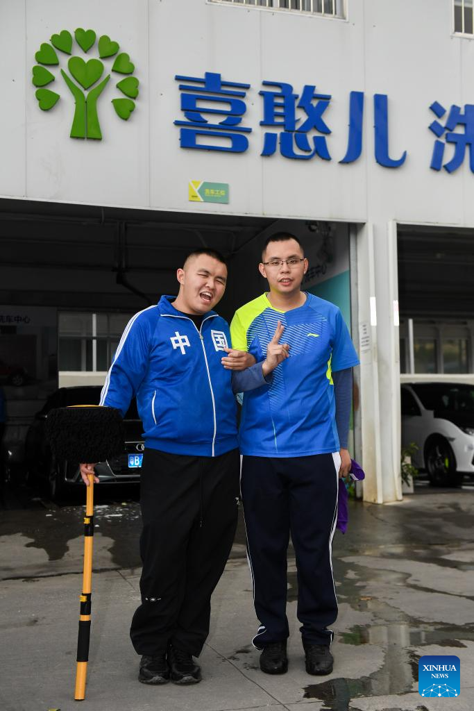 Autistic youths Wu Huajian (L) and Xu Jilun, pose for a photo at a car wash center in Shenzhen, south China's Guangdong Province, March 22, 2024. Wu Huajian, 19, and Xu Jilun, 30, worked at the car wash center since July 2023. (Xinhua/Mao Siqian)