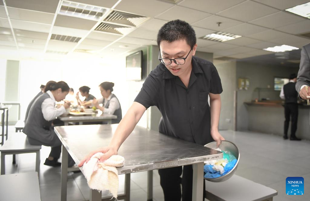 Autistic youth Guan Hao works at the staff dining hall of a hotel in Shenzhen, south China's Guangdong Province, March 27, 2024. Guan Hao, 23, joined the hotel in June 2021 as a waiter of the staff dining hall. Like other employees, he now works eight hours a day and is responsible for placing cleaned plates, cleaning up garbage and the hall. In the eyes of his leaders and colleagues, Guan is now a good employee. This Tuesday marks the 17th World Autism Awareness Day. In south China's Shenzhen, some autistic youth, who were called "children of the stars," have integrated into society and are chasing their dreams. (Xinhua/Mao Siqian)