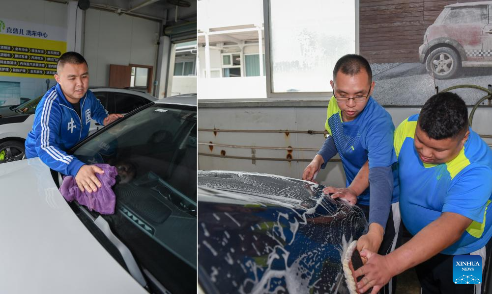 This combo photo taken on March 22, 2024 shows Wu Huajian (L) wiping a car and Xu Jilun (2nd R) washing a car with a colleague, at a car wash center in Shenzhen, south China's Guangdong Province. Wu Huajian, 19, and Xu Jilun, 30, worked at the car wash center since July 2023. (Xinhua/Mao Siqian)?