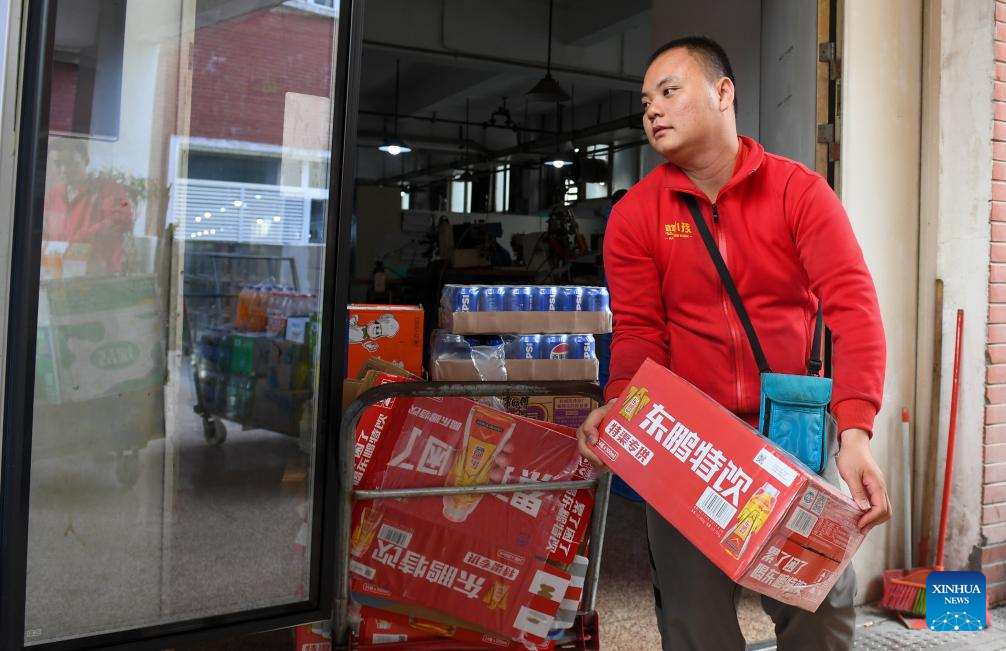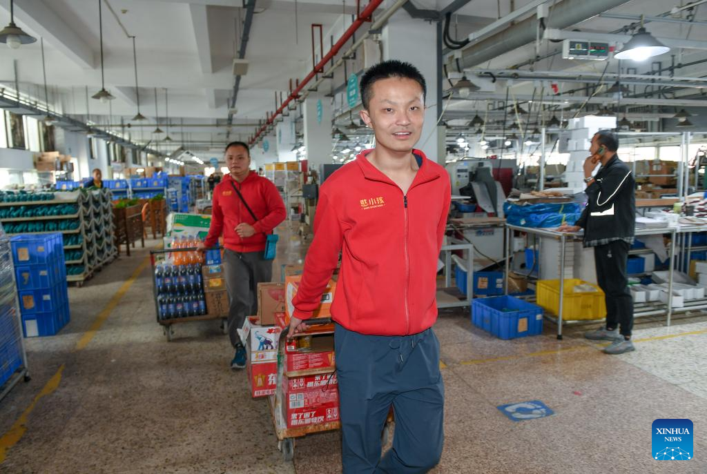 Autistic youth Huang Xuanning works at an industrial park in Shenzhen, south China's Guangdong Province, March 21, 2024. Huang Xuanning, 24, joined the industrial park in September 2023. He is responsible for loading vending machines in the factory area, including handling and placing snacks and drinks. Now he is basically qualified for the job with the help of team partners. This Tuesday marks the 17th World Autism Awareness Day. In south China's Shenzhen, some autistic youth, who were called "children of the stars," have integrated into society and are chasing their dreams.?(Xinhua/Mao Siqian)