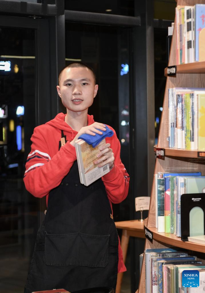 Pan Yikai, a 23-year-old autistic youth, works at a bookstore in Shenzhen, south China's Guangdong Province, March 20, 2024. He has been working part-time at the bookstore since May 2022 for 2 to 3 hours a day, responsible for wiping and arranging book shelves and cleaning the floor. This Tuesday marks the 17th World Autism Awareness Day. In south China's Shenzhen, some autistic youth, who were called "children of the stars," have integrated into society and are chasing their dreams.?(Xinhua/Zhao Ruixi)