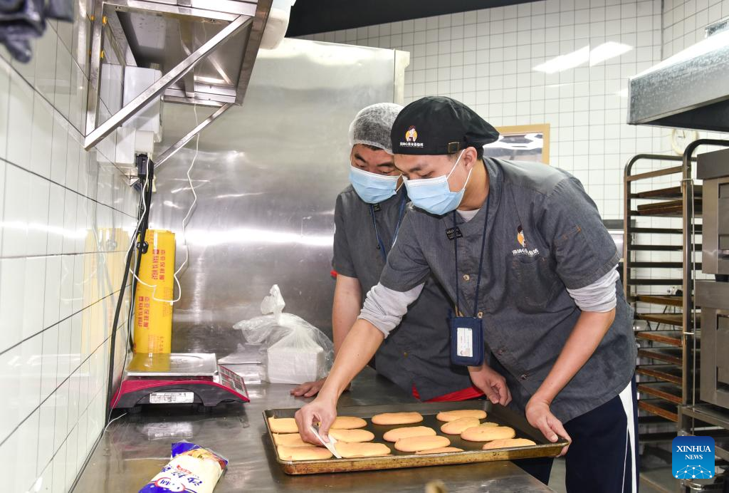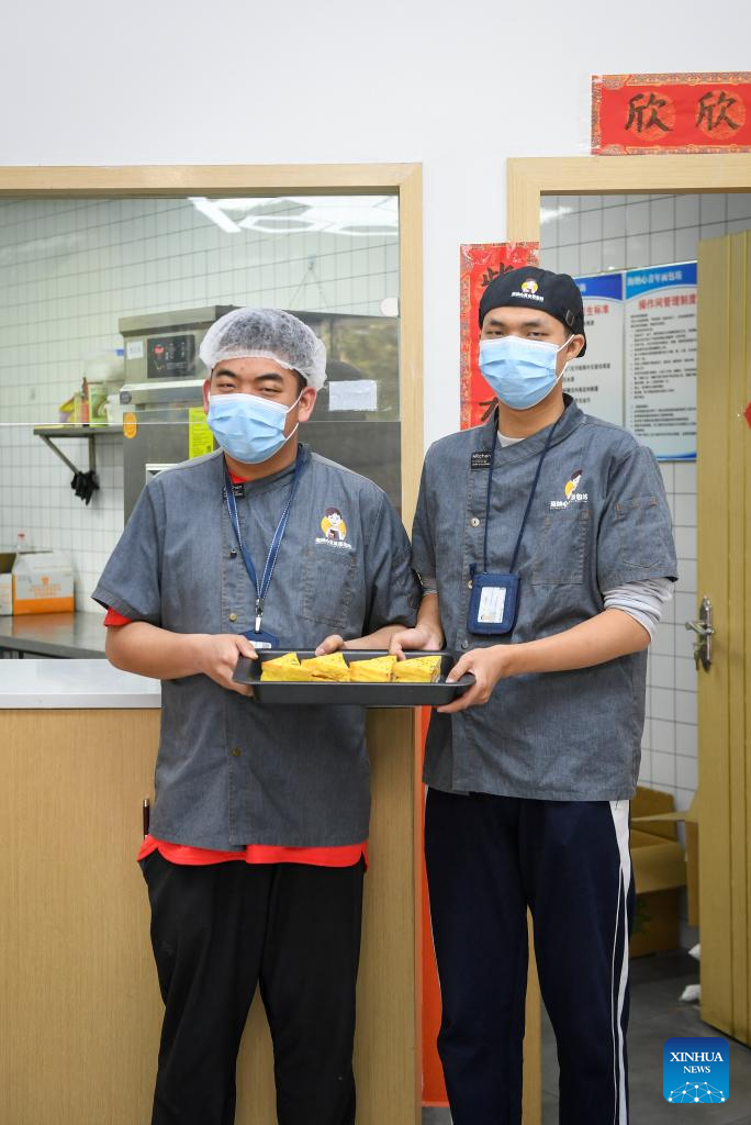 Autistic youths Liu Hanyang (R) and Peng Jingrui, make pastry at a bakery in Shenzhen, south China's Guangdong Province, March 21, 2024. Liu Hanyang, 25, and Peng Jingrui, 23, work as bakers at the bakery since June 2023. In addition to making bread and snacks with their teacher, they can also work as cashiers and deliverymen. This Tuesday marks the 17th World Autism Awareness Day. In south China's Shenzhen, some autistic youth, who were called "children of the stars," have integrated into society and are chasing their dreams. (Xinhua/Zhao Ruixi)