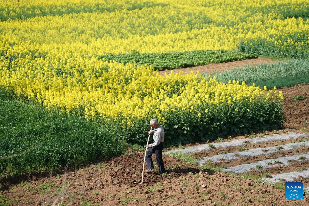 A farmer works at a field in Liangshan Township of Nanzheng District in Hanzhong, northwest China's Shaanxi Province, March 21, 2024. (Xinhua/Shao Rui)