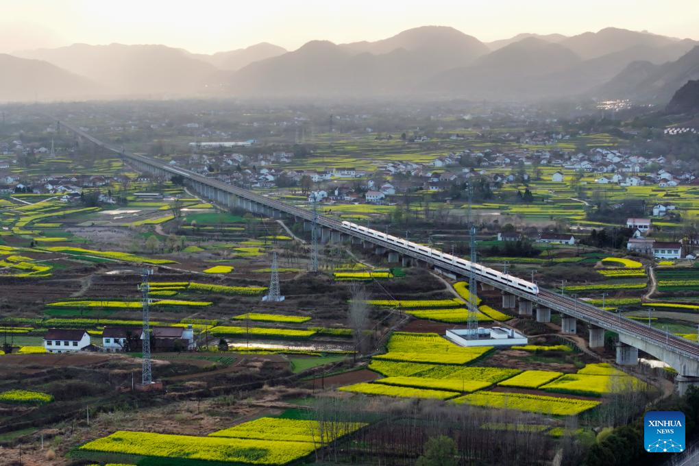An aerial drone photo taken on March 20, 2024 shows a passenger train running along the Xi'an-Chengdu high-speed railway in Yangchun Town of Nanzheng District in Hanzhong, northwest China's Shaanxi Province, (Xinhua/Shao Rui)