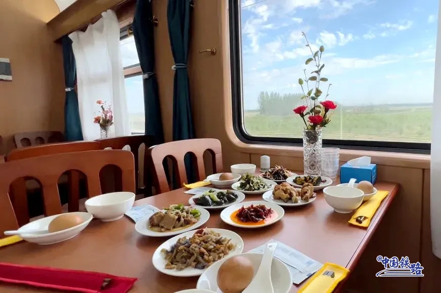 Photo shows a table of delicacies in the dining carriage of New Orient Express, a tourist-dedicated train that offers high-quality train travel around northwest China's Xinjiang Uygur Autonomous Region. (Photo/China Railway)