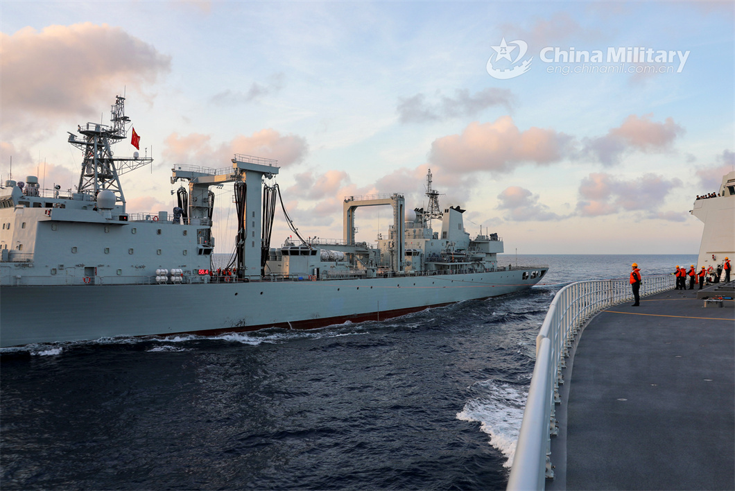 A comprehensive supply ship attached to a destroyer flotilla with the navy under the PLA Southern Theater Command provides alongside replenishment for another vessel during a comprehensive training exercise in late March, 2024. (eng.chinamil.com.cn/Photo by Huang Jiacheng)