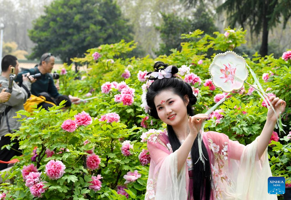 A tourist wearing traditional costumes poses with peonies at a park in Luoyang, central China's Henan Province, April 1, 2024. (Xinhua/Hao Yuan)