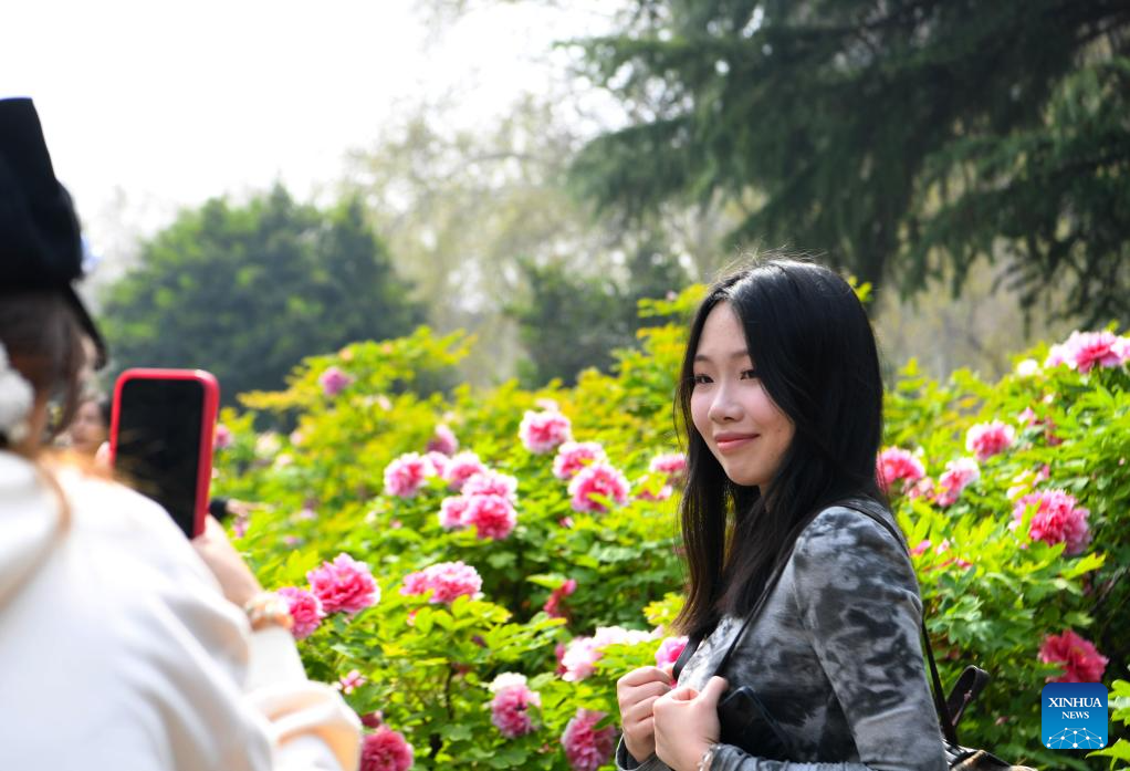Tourists enjoy blossoming peony flowers in Luoyang, C China's Henan