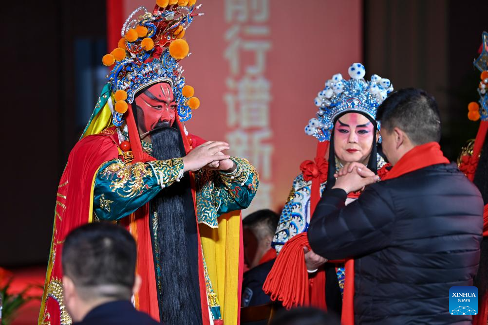 Wu Lingyun (C) stages a performance in Yingze District of Taiyuan, north China's Shanxi Province, Feb. 2, 2024. (Xinhua/Yang Chenguang)