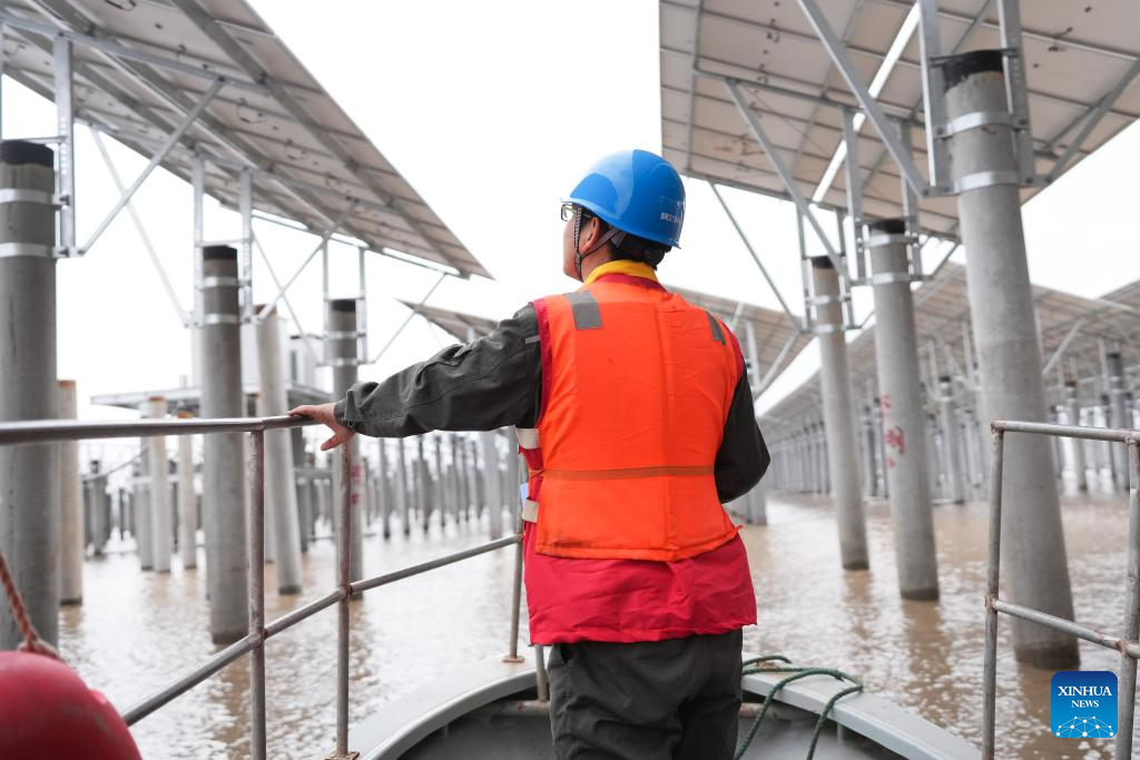 A staff member patrols in a tidal area in Sanmen County of Taizhou City, east China's Zhejiang Province, March 26, 2024. The photovoltaic power project in Sanmen County has generated over 20 million kWh of electricity. The project had a planned area of about 494 acres in size and was officially integrated into the electrical grid on Nov. 30, 2023. Following full integration into the grid, it is expected to produce up to 80 million kWh of electricity annually. (Xinhua/Weng Xinyang)
