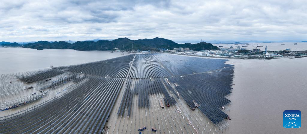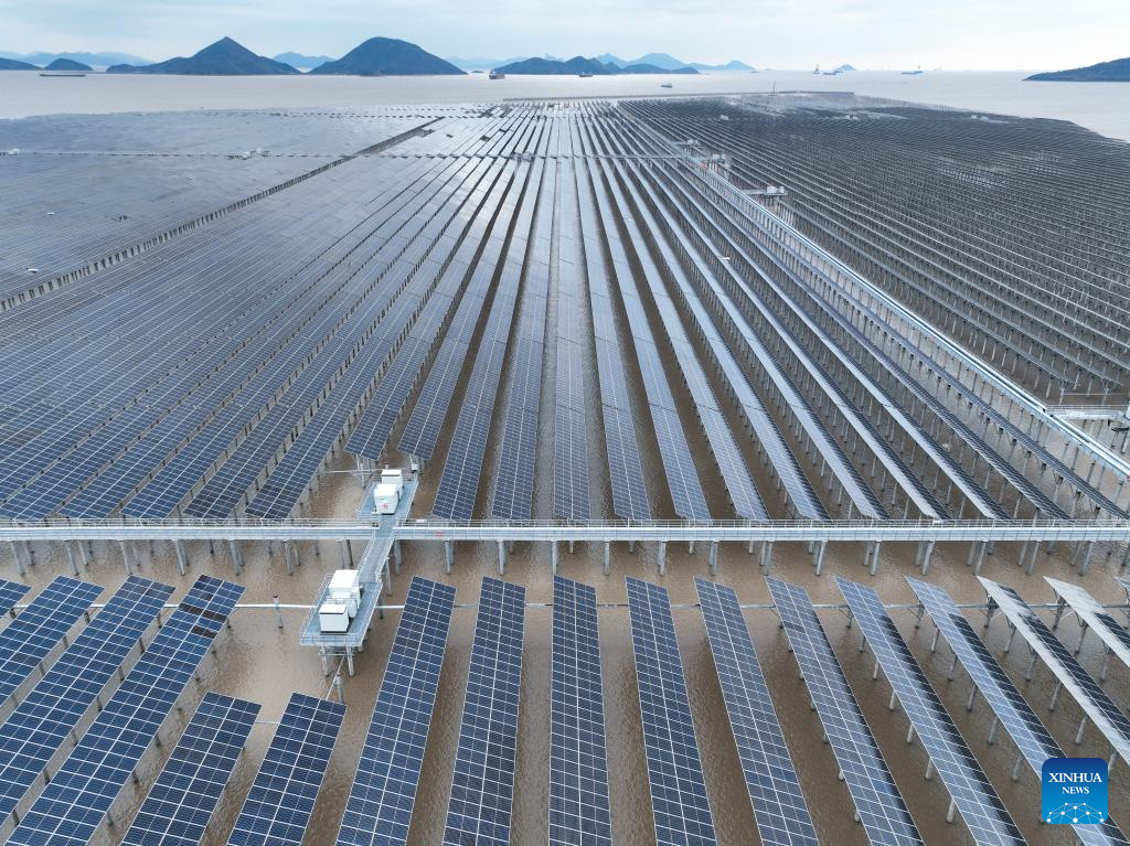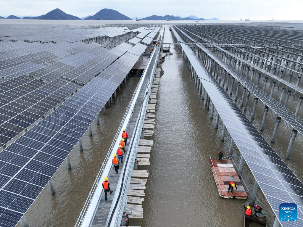 An aerial drone photo taken on March 26, 2024 shows staff members installing photovoltaic panels in the tidal area in Sanmen County of Taizhou City, east China's Zhejiang Province. The photovoltaic power project in Sanmen County has generated over 20 million kWh of electricity. The project had a planned area of about 494 acres in size and was officially integrated into the electrical grid on Nov. 30, 2023. Following full integration into the grid, it is expected to produce up to 80 million kWh of electricity annually. (Xinhua/Weng Xinyang)