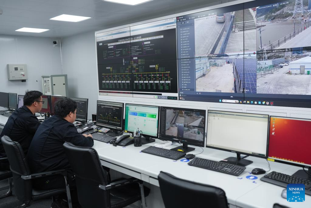 Staff members work at the control room of a photovoltaic power project in Sanmen County of Taizhou City, east China's Zhejiang Province, March 26, 2024. The photovoltaic power project in Sanmen County has generated over 20 million kWh of electricity. The project had a planned area of about 494 acres in size and was officially integrated into the electrical grid on Nov. 30, 2023. Following full integration into the grid, it is expected to produce up to 80 million kWh of electricity annually. (Xinhua/Weng Xinyang)