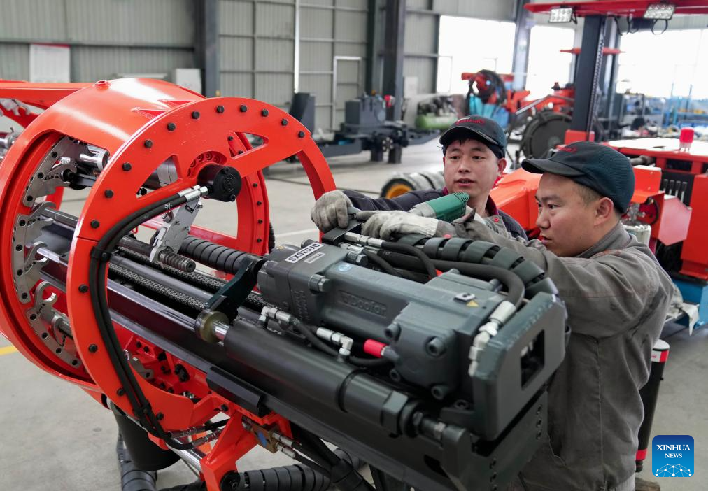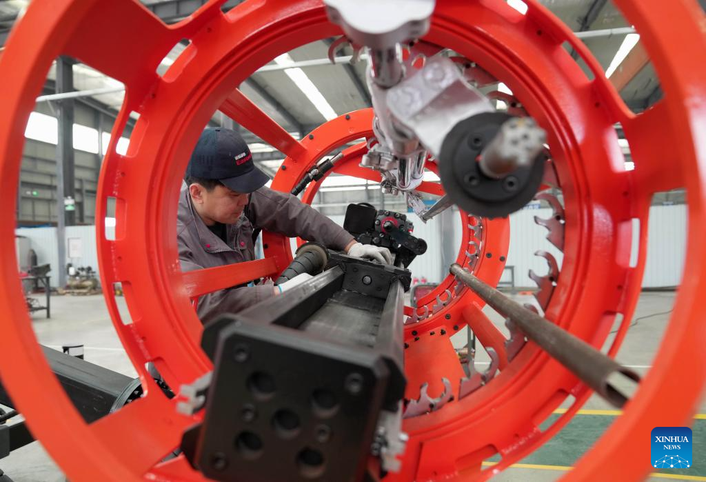 People work at a workshop of a mechanical equipment enterprise in Changli County, north China's Hebei Province, April 2, 2024. To advance high-quality economic development, local authorities of Changli has guided enterprises to focus on core technologies and improve innovation ability. (Xinhua/Yang Shiyao)