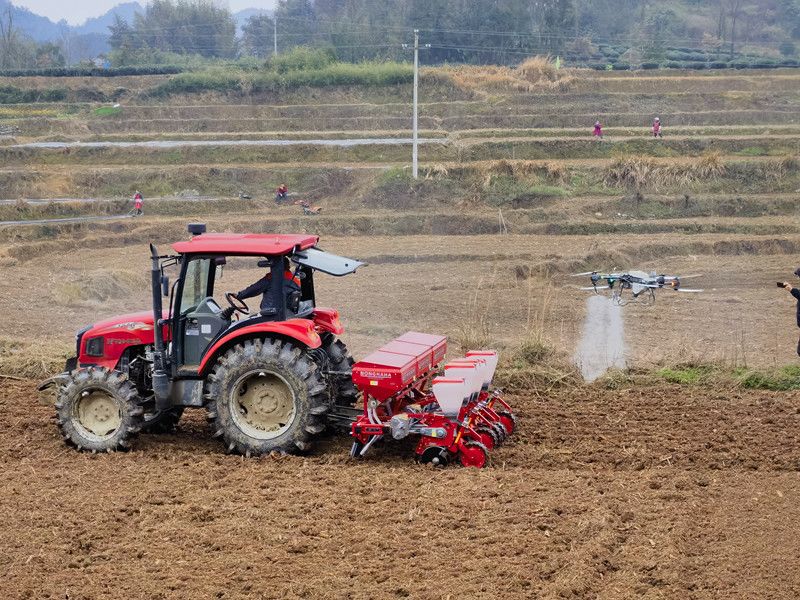 In Fenshui village, Yongxing township, Meitan county, the collaboration between seeders and drones has enabled the efficient interplanting of soybeans and corn.