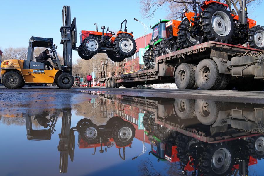 A staff member operates a forklift to load a tractor onto a truck at a tractor manufacturing company in Jiamusi, northeast China's Heilongjiang Province, March 12, 2024. (Xinhua/Wang Jianwei)
