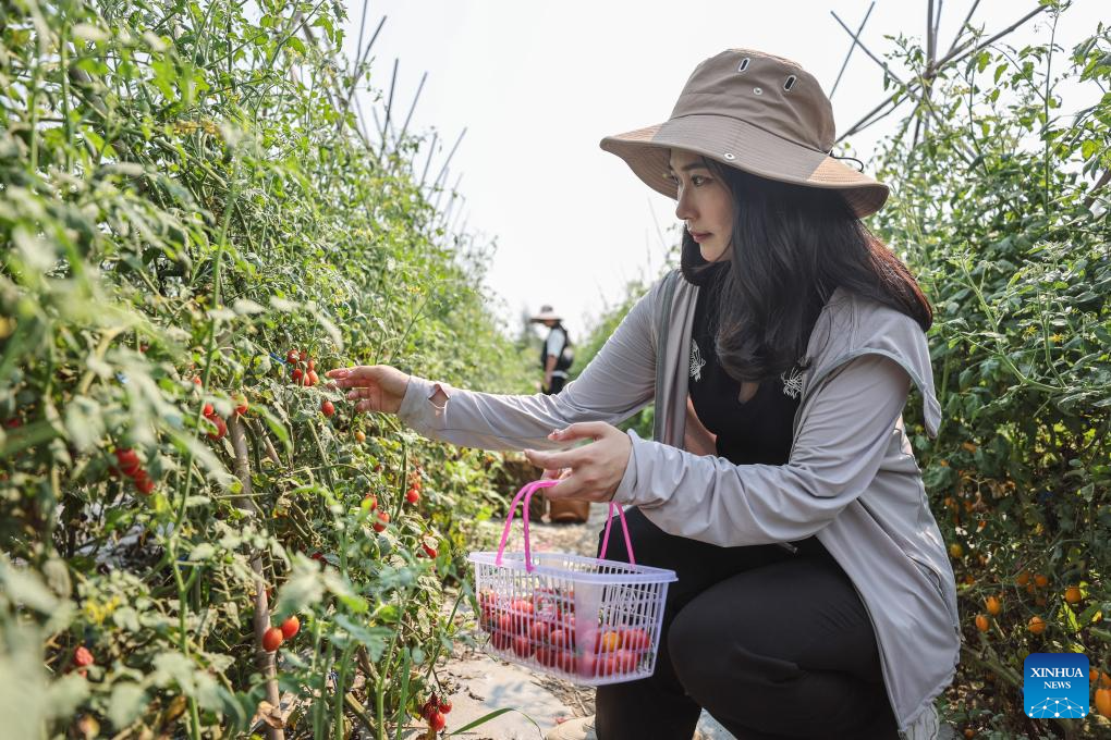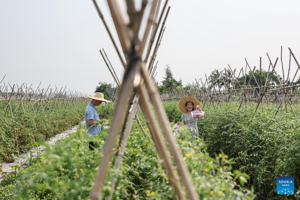 Tourists take part in a cherry tomato picking activity in Tanli Village of Dingan County, south China's Hainan Province, April 3, 2024. Dingan County held a cherry tomato picking festival on Wednesday. Various activities were carried out to promote the cherry tomato planting industry and local tourism. (Xinhua/Zhang Liyun)