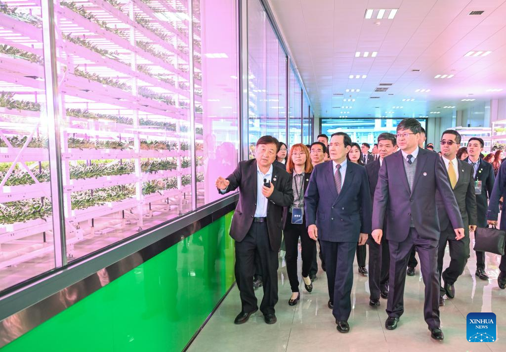 Ma Ying-jeou, former chairman of the Chinese Kuomintang party, and members of a delegation of young people from Taiwan visit a plant factory of Yangling agricultural hi-tech industrial demonstration zone in northwest China's Shaanxi Province, April 5, 2024. A delegation of young people from Taiwan led by Ma visited the Yangling agricultural hi-tech industrial demonstration zone on Friday. (Xinhua/Chen Yehua)