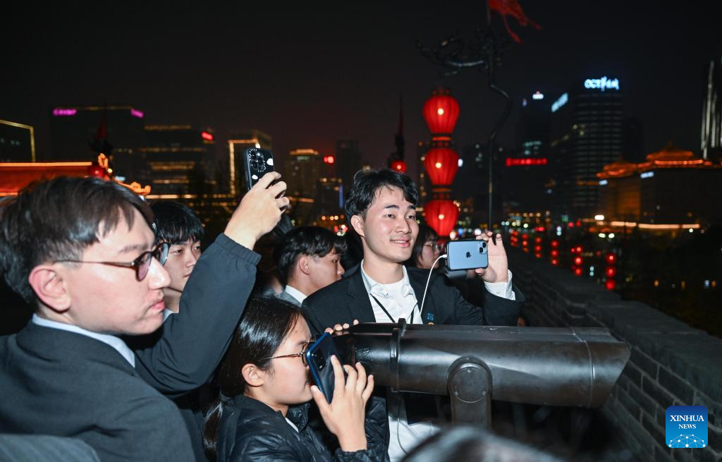 Members of a delegation of young people from Taiwan led by Ma Ying-jeou, former chairman of the Chinese Kuomintang party, visit the Yongning Gate of the ancient city wall in Xi'an, northwest China's Shaanxi Province, April 5, 2024. A delegation of young people from Taiwan led by Ma visited the ancient city wall scenic spot in Xi'an on Friday. (Xinhua/Chen Yehua)