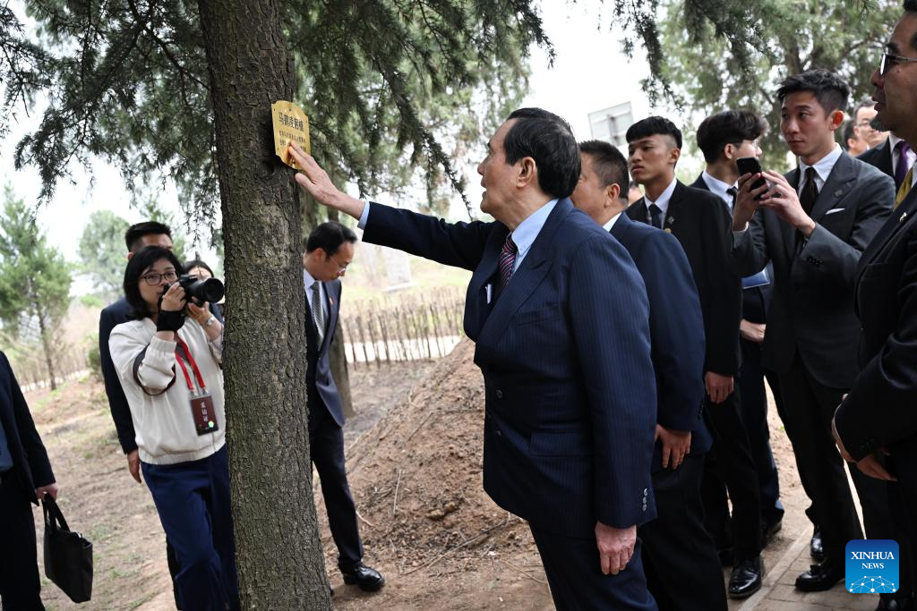 Ma Ying-jeou, former chairman of the Chinese Kuomintang party, touches a tree planted by Ma Ho-ling near the tomb of Ma Yuan in Baoji City, northwest China's Shaanxi Province, April 5, 2024. A delegation of young people from Taiwan led by Ma visited the Ancestral Hall and the tomb of Ma Yuan on Friday. (Xinhua/Chen Yehua)