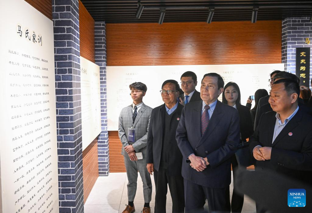 Ma Ying-jeou, former chairman of the Chinese Kuomintang party, and members of a delegation of young people from Taiwan visit a museum of the Ancestral Hall of Ma Yuan at the Yangling demonstration zone in northwest China's Shaanxi Province, April 5, 2024. A delegation of young people from Taiwan led by Ma visited the Ancestral Hall and the tomb of Ma Yuan on Friday. (Xinhua/Chen Yehua)