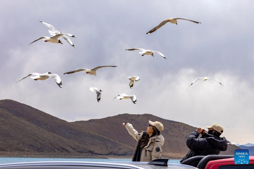 Tourists feed brown-headed gulls by the Yamzbog Yumco Lake in southwest China's Xizang Autonomous Region, April 5, 2024. (Xinhua/Zhang Rufeng)