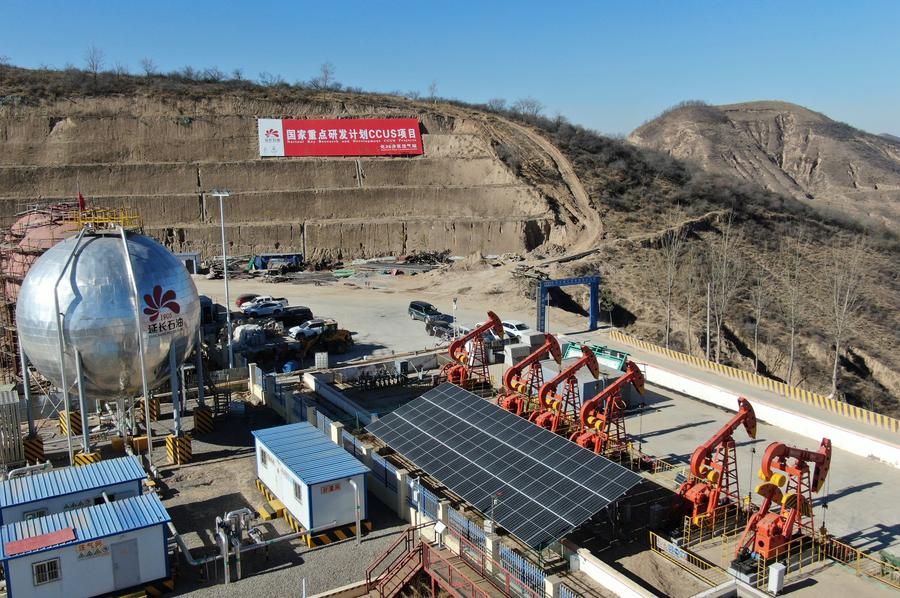 An aerial drone photo taken on Dec. 1, 2023 shows a demonstration project for carbon capture, utilization, and storage (CCUS) by Shaanxi Yanchang Petroleum (Group) Co., Ltd. in Ansai District of Yan'an, northwest China's Shaanxi Province. (Xinhua/Li Yibo)