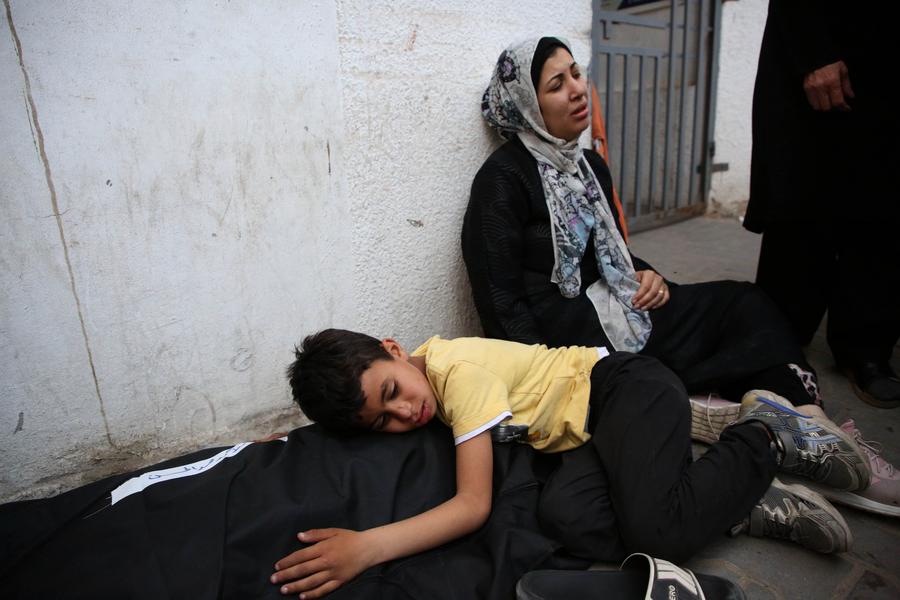 A boy mourns over the body of his relative in the southern Gaza Strip city of Rafah, on April 1, 2024. (Photo by Khaled Omar/Xinhua)