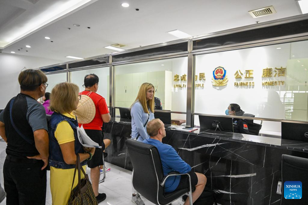 Foreign tourists apply for temporary entry permits at the Tianjin Dongjiang border inspection station in north China's Tianjin Municipality on April 7, 2024. (Xinhua/Sun Fanyue)