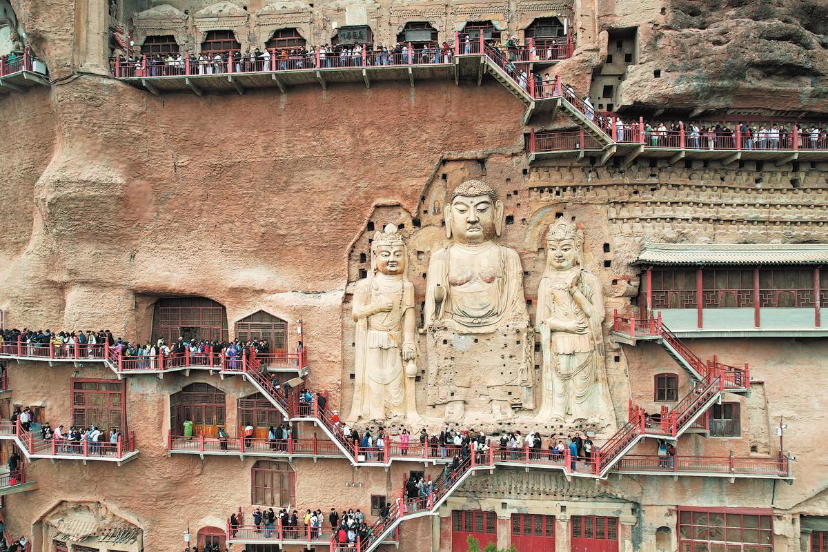 Tourists throng the Maijishan Grottoes on Friday in Tianshui, Gansu province. Over the three-day Qingming Festival holiday, Tianshui received around 946,500 tourist visits, generating a revenue of 540 million yuan ($74.65 million). Zhang Zhimin / Xinhua