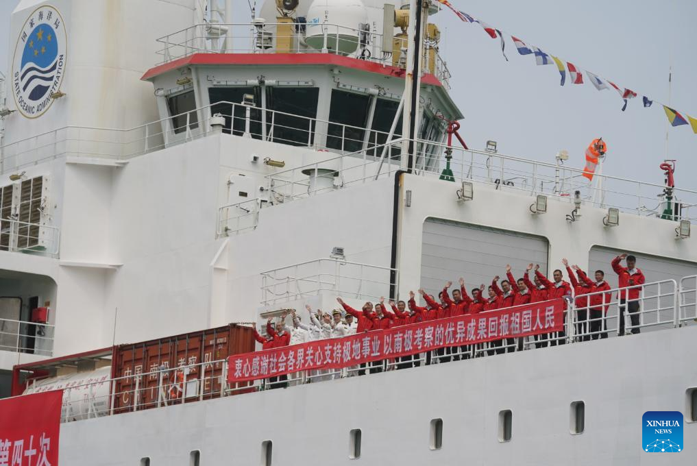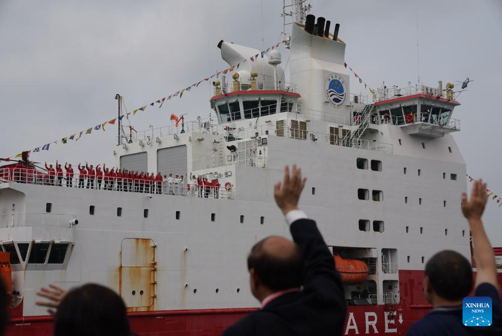China's polar icebreaker Xuelong 2, or Snow Dragon 2, enters the Ocean Terminal in Tsim Sha Tsui, Hong Kong, south China, April 8, 2024. China's first domestically made polar icebreaker Xuelong 2, or Snow Dragon 2, arrived in Hong Kong for the very first time on Monday for a five-day visit. (Xinhua/Lui Siu Wai)