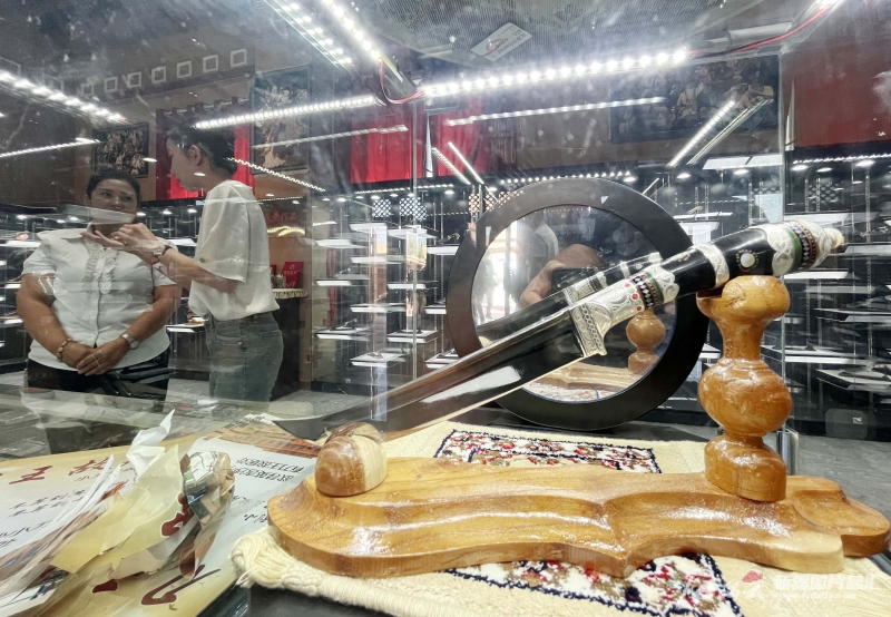 Photo taken on Sept. 5, 2023 shows a Yengisar knife displayed at a knife trading center in Kalabashlangan village of Yengisar county, northwest China’s Xinjiang Uygur Autonomous Region. (Photo/ts.cn)