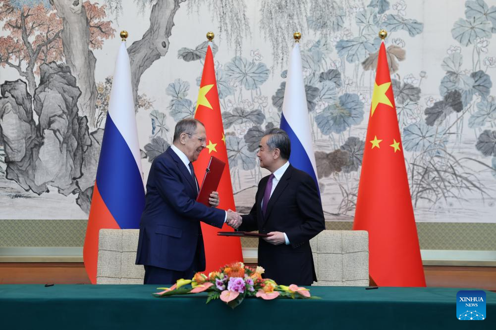 Chinese Foreign Minister Wang Yi, also a member of the Political Bureau of the Communist Party of China Central Committee, and Minister of Foreign Affairs of the Russian Federation Sergey Lavrov sign the plan on consultation between the two foreign ministries for 2024 after their talks in Beijing, capital of China, April 9, 2024. Wang held talks with Lavrov in Beijing on Tuesday. (Xinhua/Chen Bin)