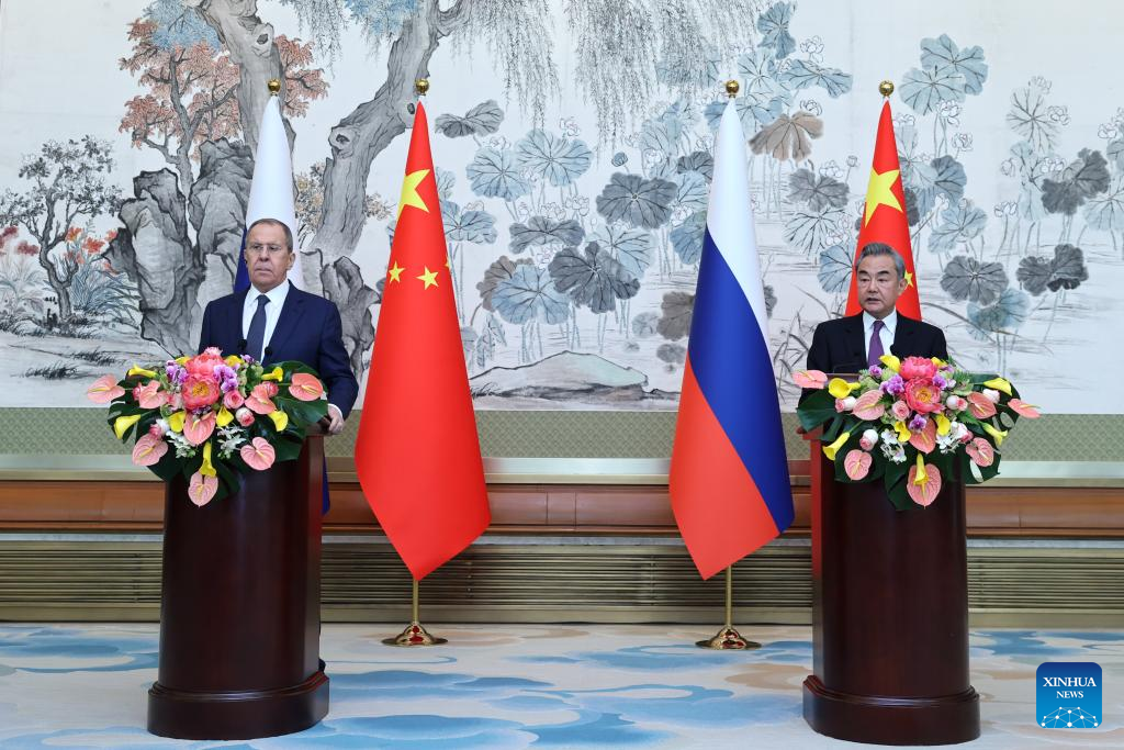Chinese Foreign Minister Wang Yi, also a member of the Political Bureau of the Communist Party of China Central Committee, and Minister of Foreign Affairs of the Russian Federation Sergey Lavrov attend a joint press briefing after their talks in Beijing, capital of China, April 9, 2024. Wang held talks with Lavrov in Beijing on Tuesday. (Xinhua/Chen Bin)