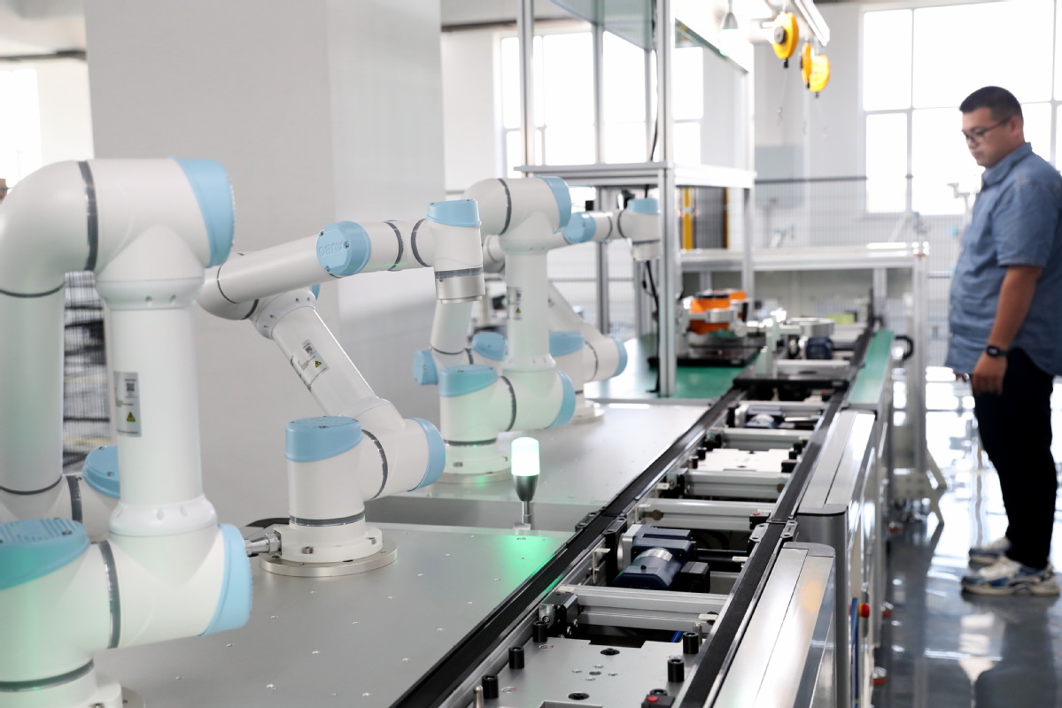 A technician inspects equipment at an intelligent robot manufacturer in Zibo in July. [WANG JING/CHINA DAILY]