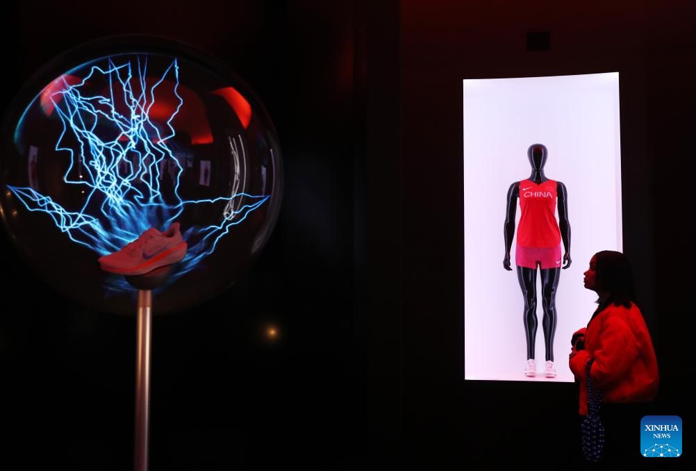 A visitor passes by Nike Olympics Products for Chinese women athletes during a Paris Olympics kits unveiling event held by Nike in Paris, France, April 11, 2024. (Xinhua/Gao Jing)