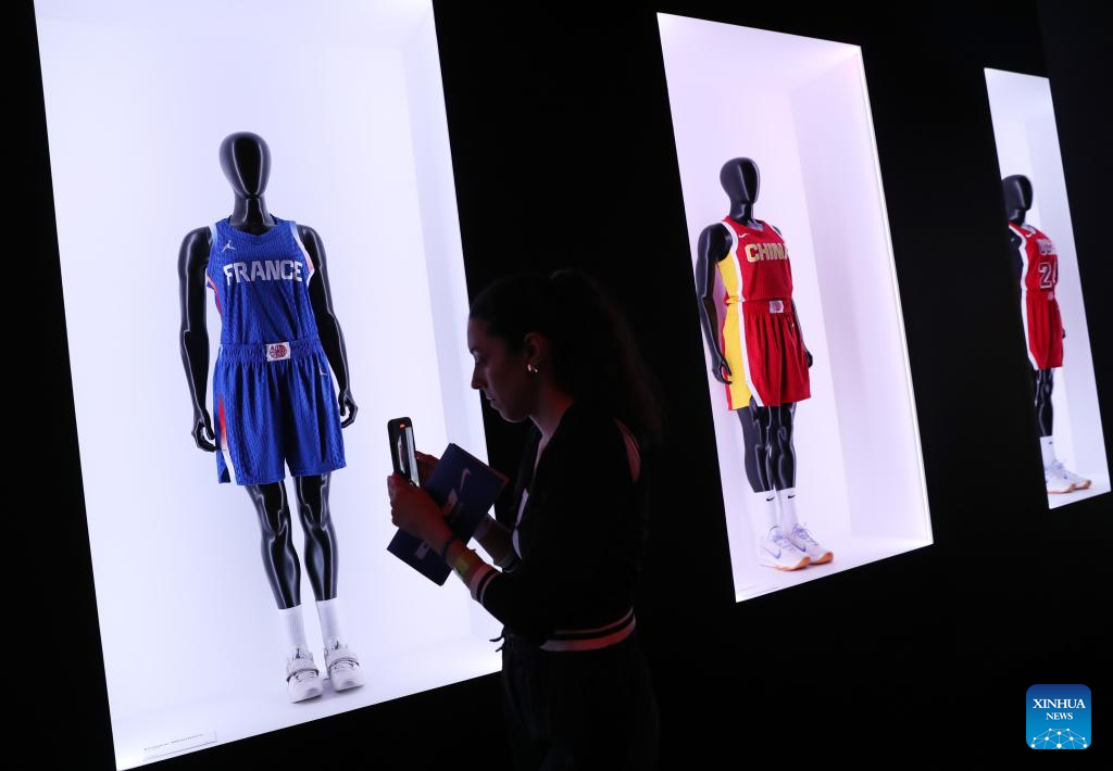 A visitor takes photos of Nike Olympics Products during a Paris Olympics kits unveiling event held by Nike in Paris, France, April 11, 2024. (Xinhua/Gao Jing)
