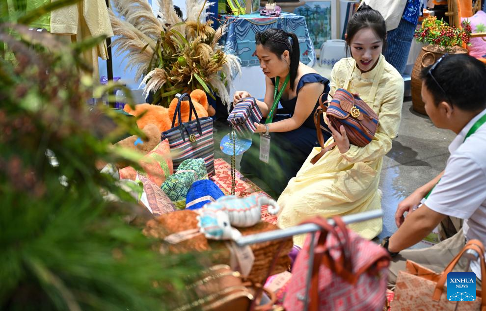 Visitors select products designed with elements of Li ethnic group at the fourth China International Consumer Products Expo (CICPE) in Haikou, capital city of south China's Hainan Province, April 13, 2024. A batch of domestic brands have attracted a lot of visitors at the expo. (Xinhua/Guo Cheng)