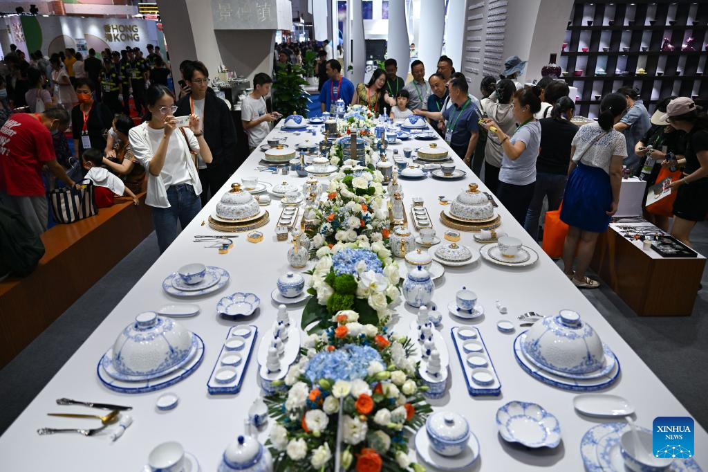 Porcelain artworks from Jingdezhen of China are displayed at the fourth China International Consumer Products Expo (CICPE) in Haikou, capital city of south China's Hainan Province, April 14, 2024. A batch of domestic brands have attracted a lot of visitors at the expo. (Xinhua/Guo Cheng)
