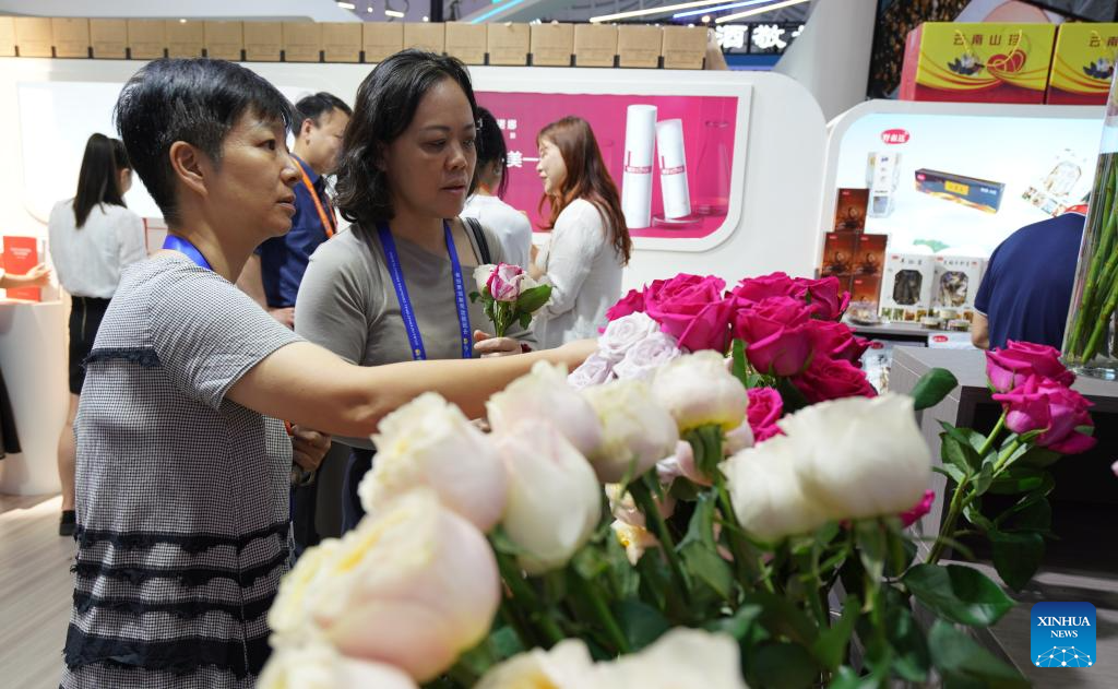 Visitors select roses at the Yunnan booth of the fourth China International Consumer Products Expo (CICPE) in Haikou, capital city of south China's Hainan Province, April 14, 2024. A batch of domestic brands have attracted a lot of visitors at the expo. (Xinhua/Li Mengjiao)
