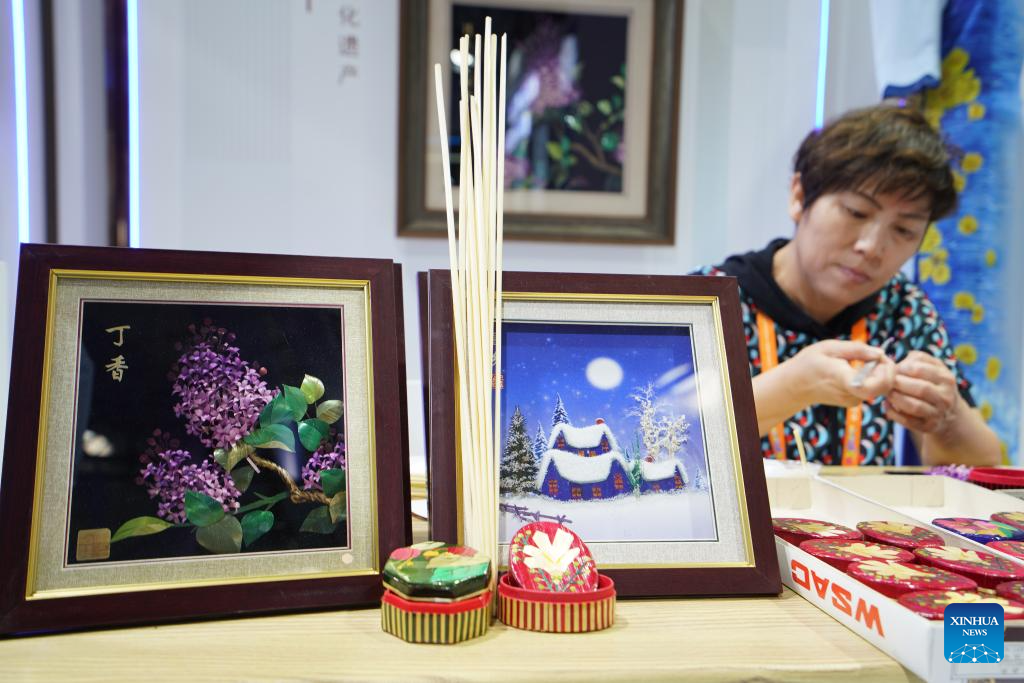 Paintings made of wheat straw are displayed at the fourth China International Consumer Products Expo (CICPE) in Haikou, capital city of south China's Hainan Province, April 14, 2024. A batch of domestic brands have attracted a lot of visitors at the expo. (Xinhua/Li Mengjiao)
