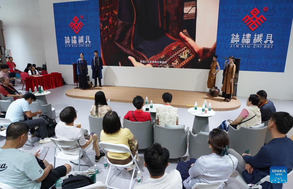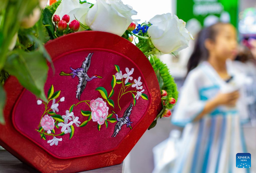 An embroidery is displayed at the Yunnan booth of the fourth China International Consumer Products Expo (CICPE) in Haikou, capital city of south China's Hainan Province, April 14, 2024. A batch of domestic brands have attracted a lot of visitors at the expo. (Xinhua/Tian Weiwei)