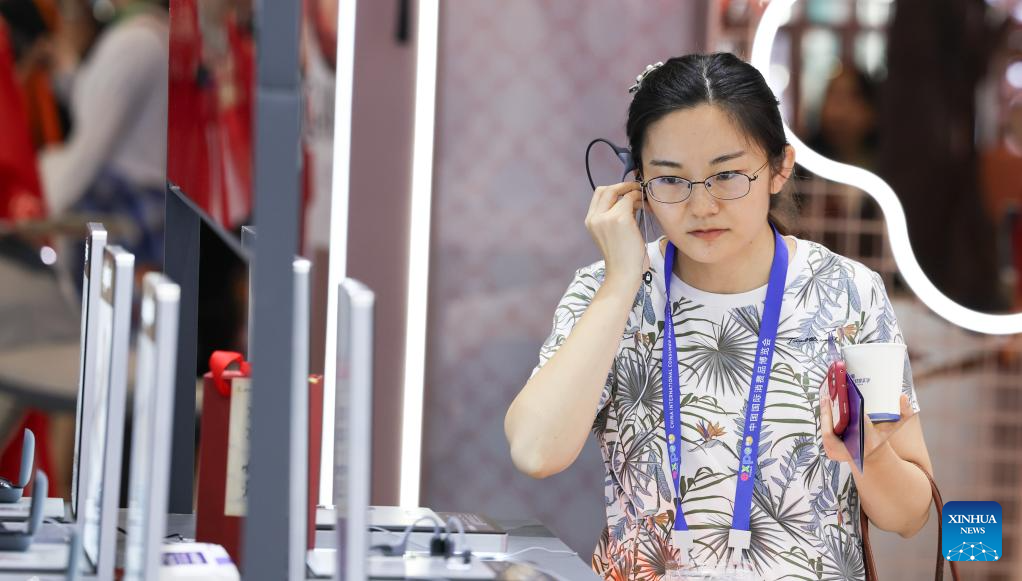 A visitor tries an earphone at the booth of China's Shokz at the fourth China International Consumer Products Expo (CICPE) in Haikou, capital city of south China's Hainan Province, April 14, 2024. A batch of domestic brands have attracted a lot of visitors at the expo. (Xinhua/Yang Guanyu)