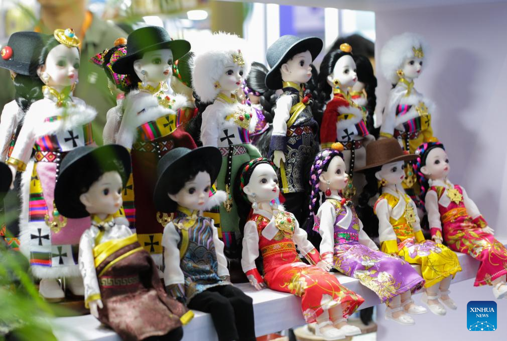 Puppets dressed in costumes of Tibetan ethnic group are displayed at the fourth China International Consumer Products Expo (CICPE) in Haikou, capital city of south China's Hainan Province, April 14, 2024. A batch of domestic brands have attracted a lot of visitors at the expo. (Xinhua/Tian Weiwei)