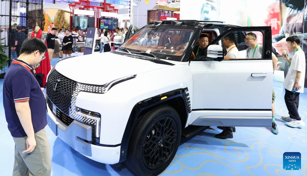 Visitors view a domestic new energy vehicle at the fourth China International Consumer Products Expo (CICPE) in Haikou, capital city of south China's Hainan Province, April 13, 2024. A batch of domestic brands have attracted a lot of visitors at the expo. (Xinhua/Guo Cheng)
