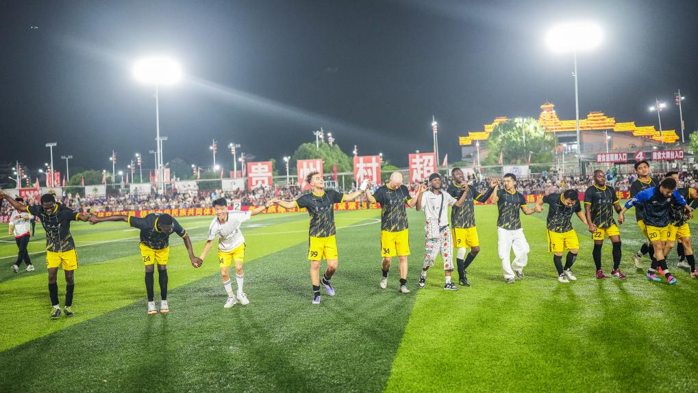 Players of Guizhou University international students football team greet spectators after a friendly football match in Rongjiang County of southwest China's Guizhou Province, April 13, 2024.(Xinhua/Tao Liang)