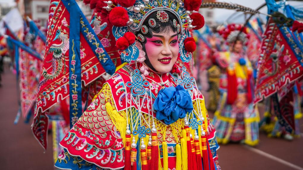 A member of the cheerleader team of Jiangxi Rice Noodle team is seen before the start of a friendly football match in Rongjiang County of southwest China's Guizhou Province, April 13, 2024.(Xinhua/Tao Liang)