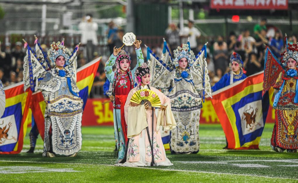 International students from Guizhou University greet spectators after their performance during a friendly football match in Rongjiang County of southwest China's Guizhou Province, April 13, 2024.(Xinhua/Tao Liang)