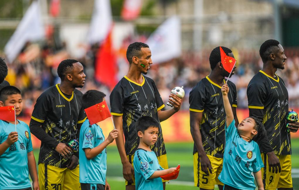 International students from Guizhou University perform during a friendly football match in Rongjiang County of southwest China's Guizhou Province, April 13, 2024.(Xinhua/Tao Liang)