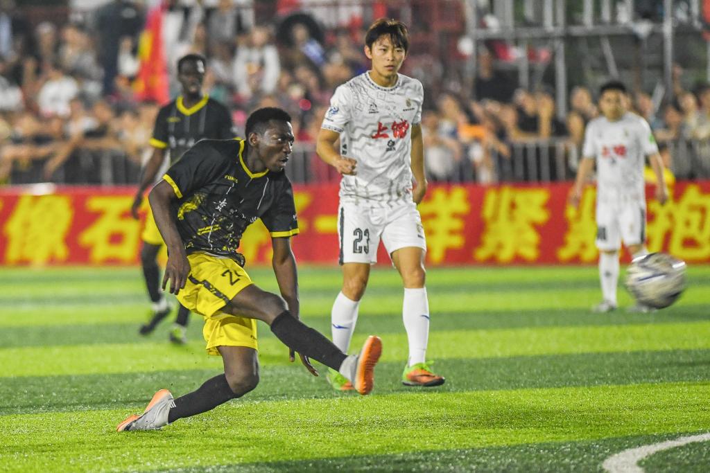 Guinea's Loua Augustin Bonaventure, a player of Guizhou University international students football team, competes during a friendly football match in Rongjiang County of southwest China's Guizhou Province, April 13, 2024. (Xinhua/Tao Liang)