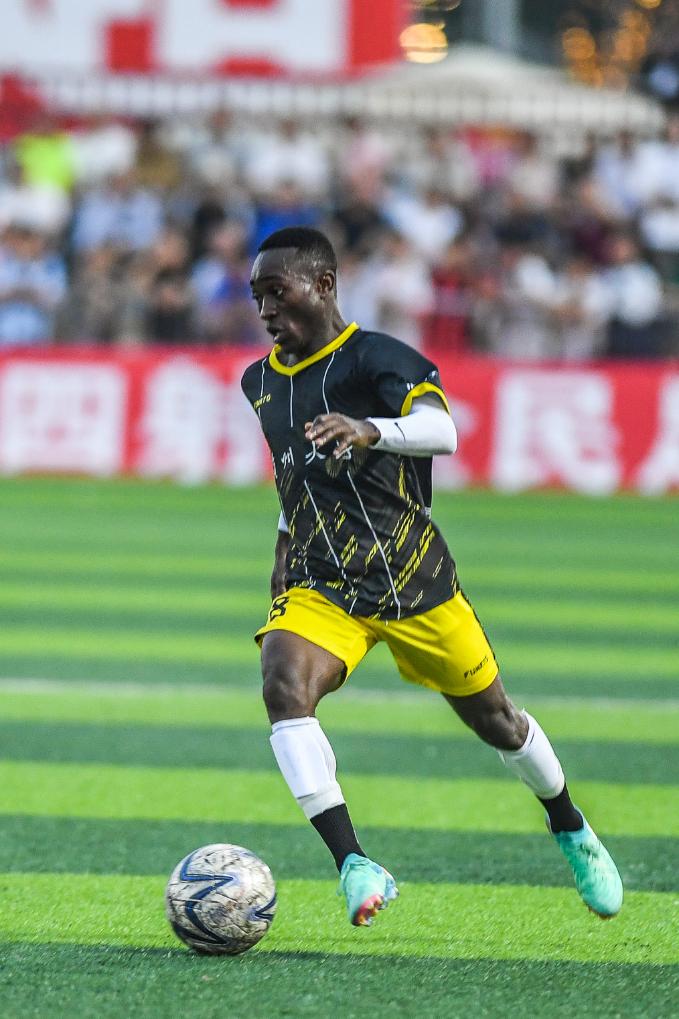 Gabon's Mvore Ressavou Isaac Romaric Christopher, a player of Guizhou University international students football team, competes during a friendly football match in Rongjiang County of southwest China's Guizhou Province, April 13, 2024.(Xinhua/Tao Liang)